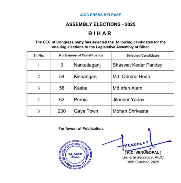 News Topical, Digital Desk : The Congress party has released its third list of candidates for the Bihar Assembly elections. The party has announced the names of five candidates. So far, the party has announced candidates for 54 seats in Bihar.